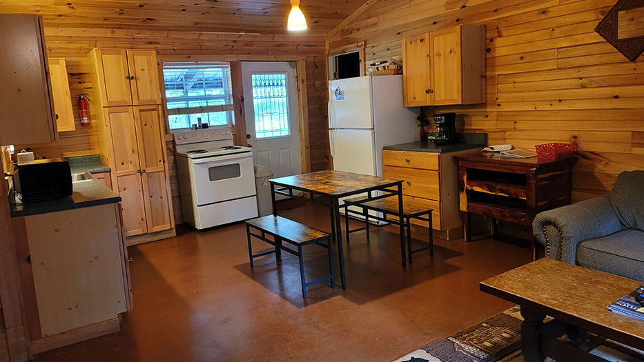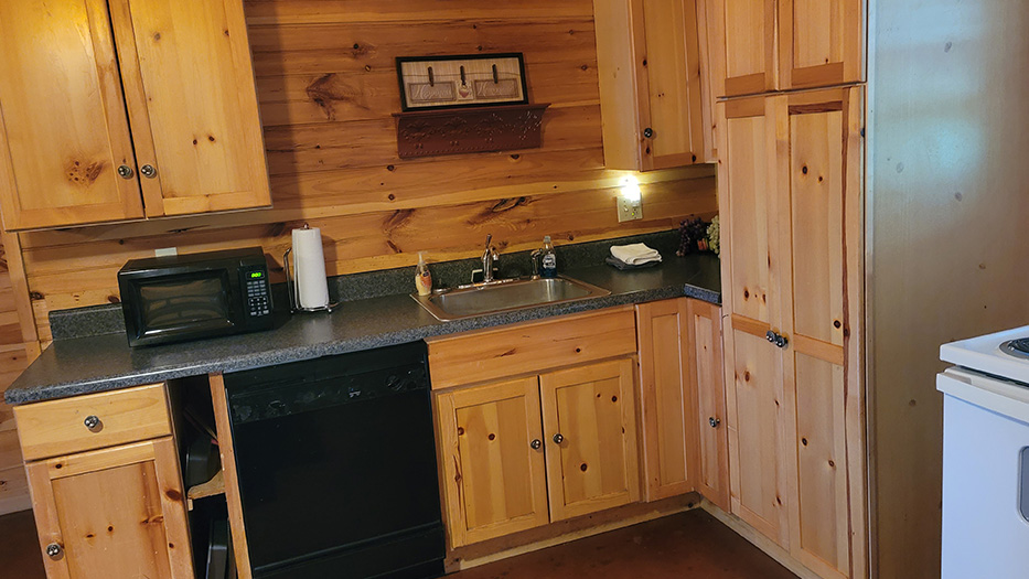 - The interior of this quaint cabin touts beautiful rustic pine with exposed metal ducts, comfortable furniture, central heat and air, full kitchen with oven, range, dishwasher, microwave, coffee makers and full size refrigerators.